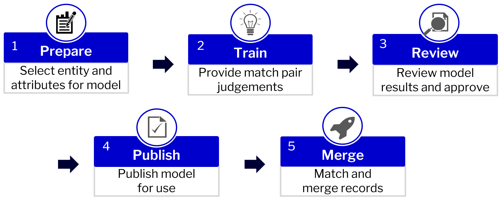 Traditional methods of matching are performed based on a set of instructions coded in the underlying legacy MDM platform. Configuring match rules here requires a series of time-consuming steps iterated until all stakeholders agree on the configuration that should be used for matching. Even the most efficient execution takes weeks or even months to complete across a process that includes most of these steps:
