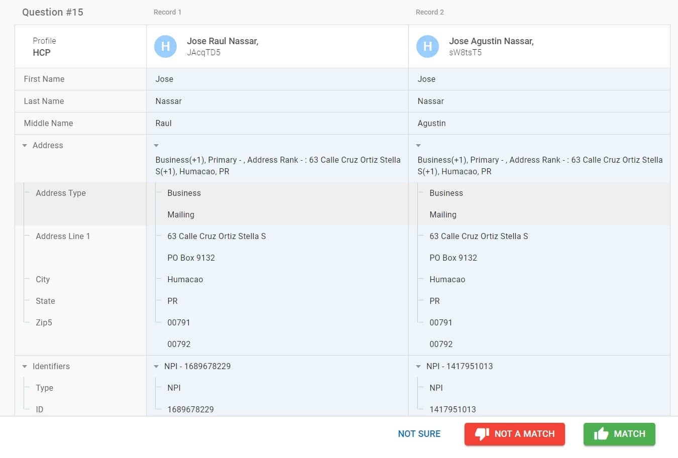 - Next, the user trains the business model using an active learning process. This involves reviewing pairs of records presented by Match IQ. For each pair, the user selects “Match,” “Not a Match” or “Not Sure.” Users can tune the accuracy of match desired (i.e., exact or fuzzy matching) by simply approving similar, but not exact, matches. For example, matching Dick Jones and Richard Jones would enable fuzzy matching of first names.