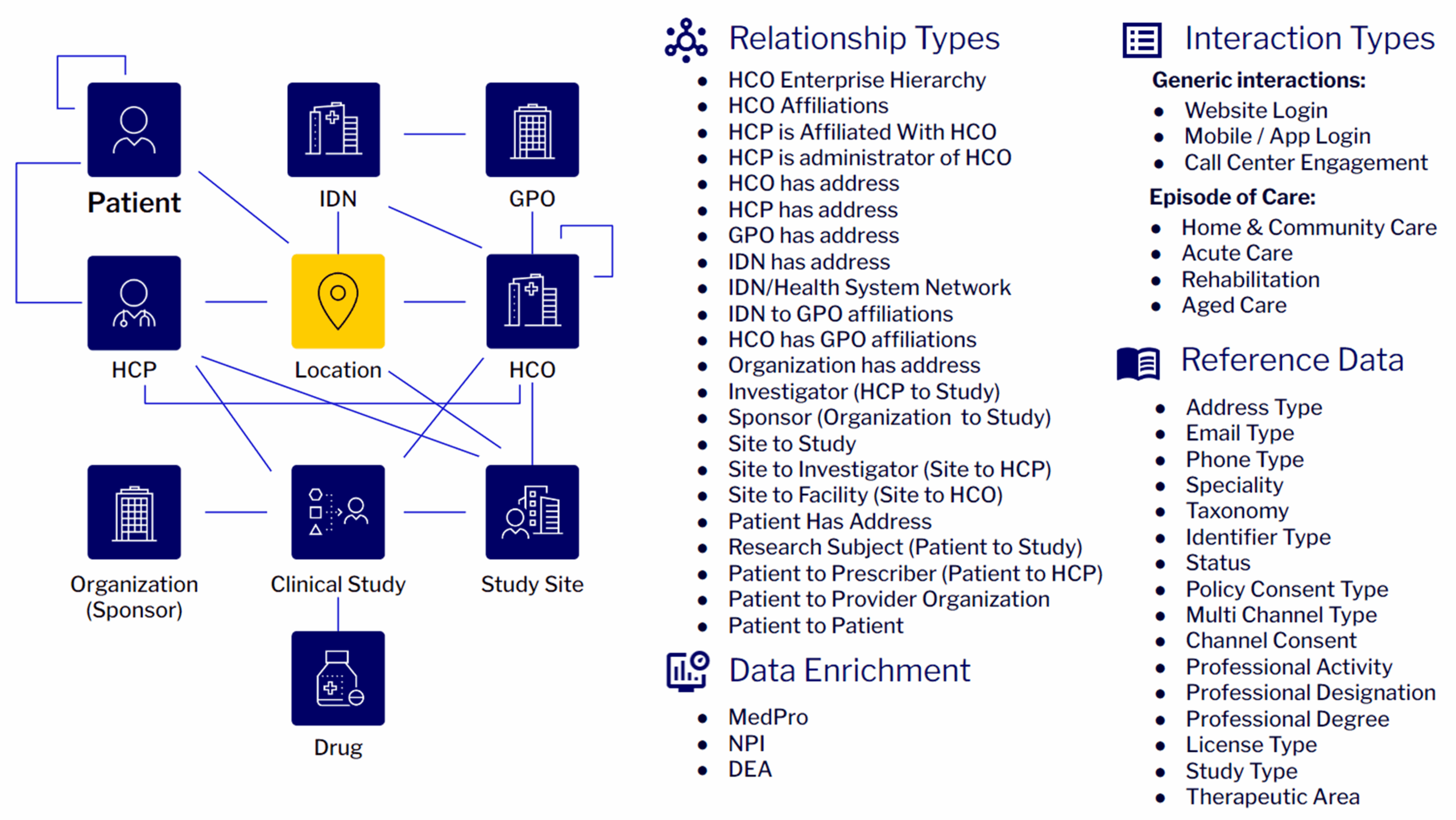 Easily connect to any application, data source, or AI system. Enrich your data with third-party sources like DEA, NPI, and MedPro.
